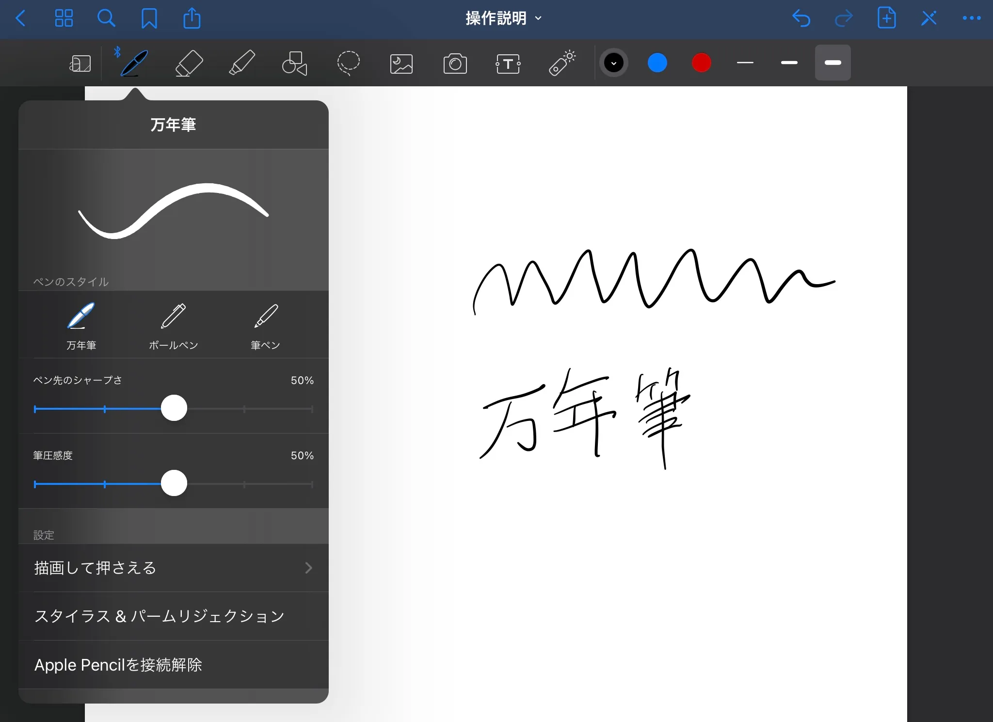 手書き用の最も基本的なツールです.「万年筆」「ボールペン」「筆ペン」の3種類から選択できます.