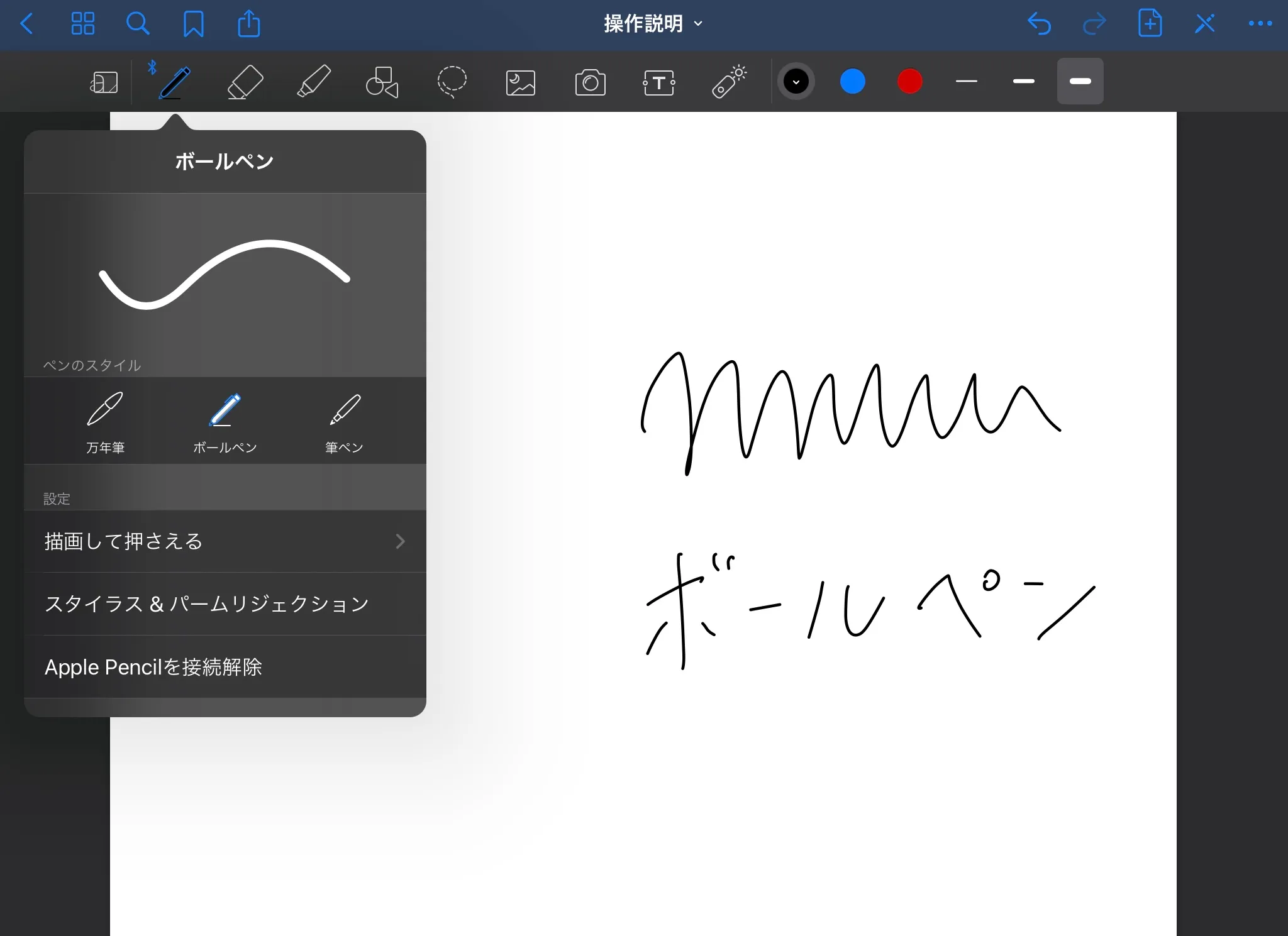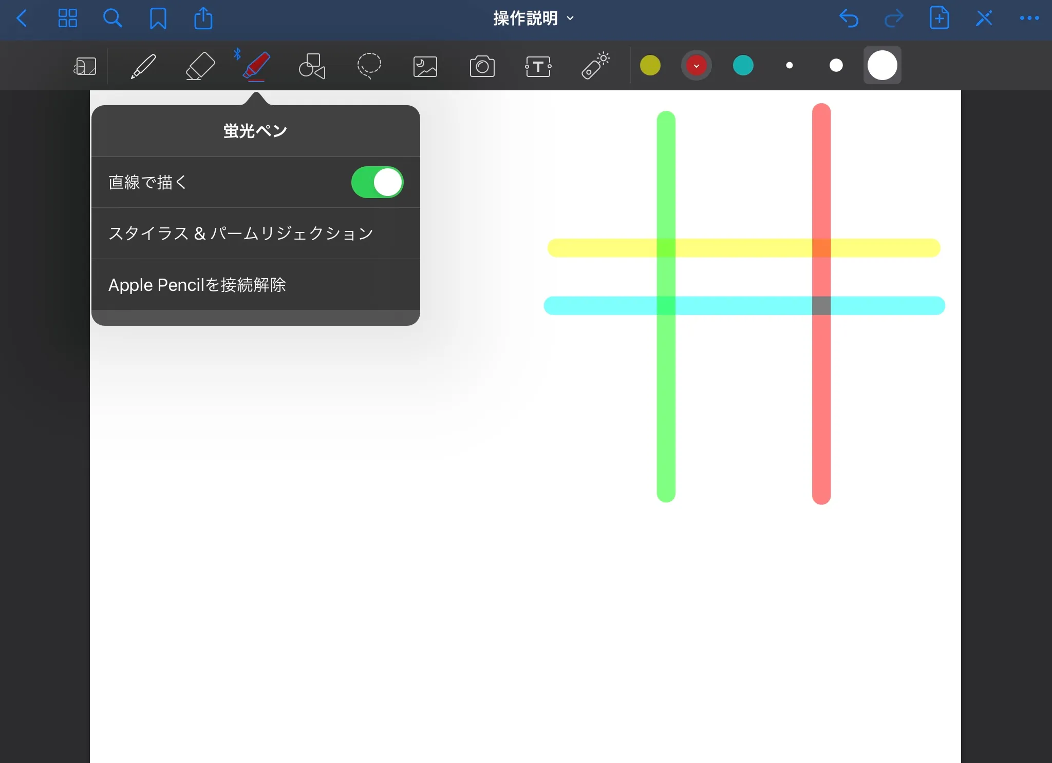 アイコンを⻑押しすると,下の画像のようにメニューに「直線で描く」が現れます.これを選択すると,多少ブレた線を引いてしまっても⾃動的に直線に修正されます.