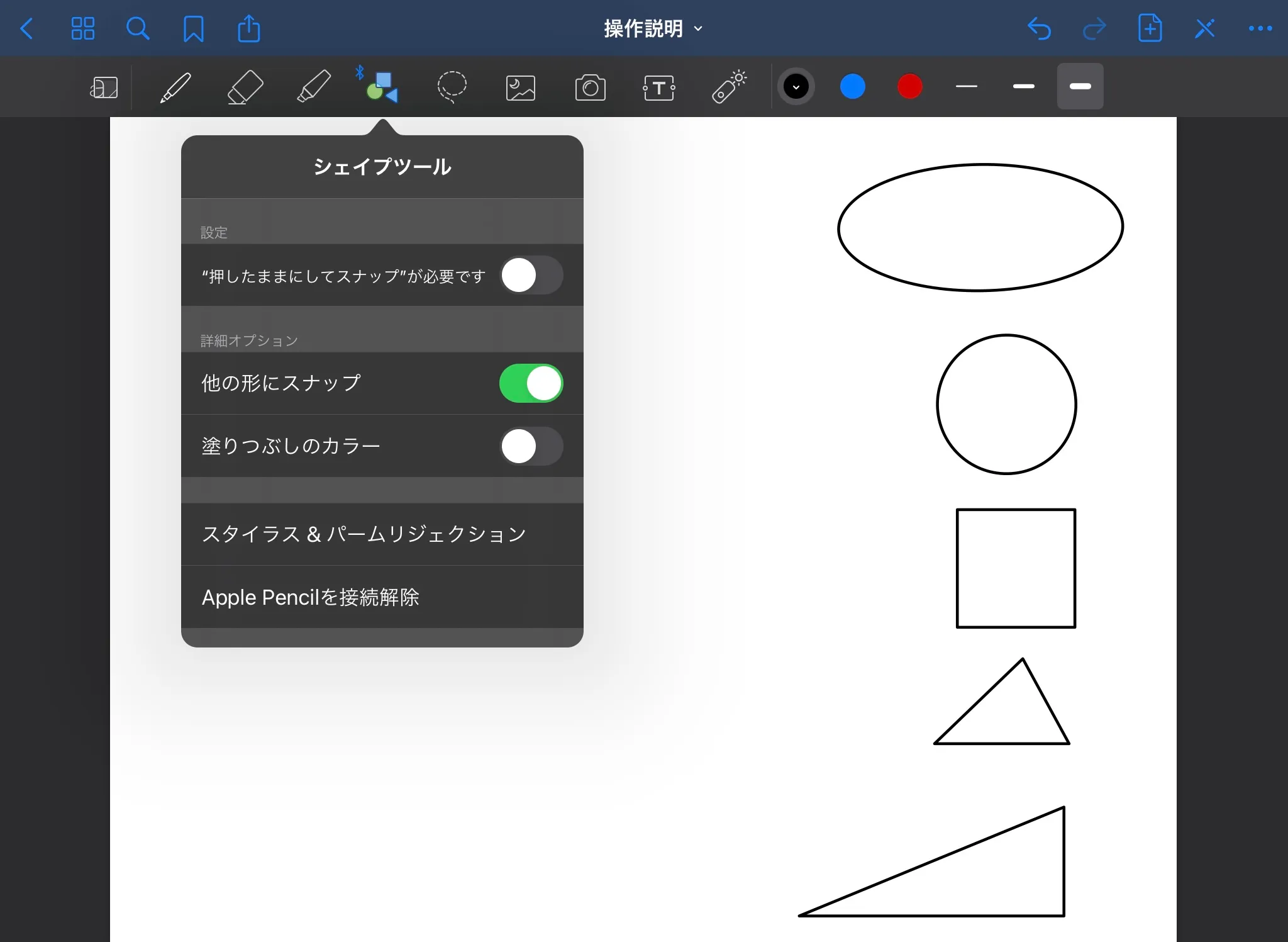 シェイプツールを用いて手描きで楕円(だえん)や円,四角形,三角形等を描画すると,下の画像のように自動で近い形状に修正されます.