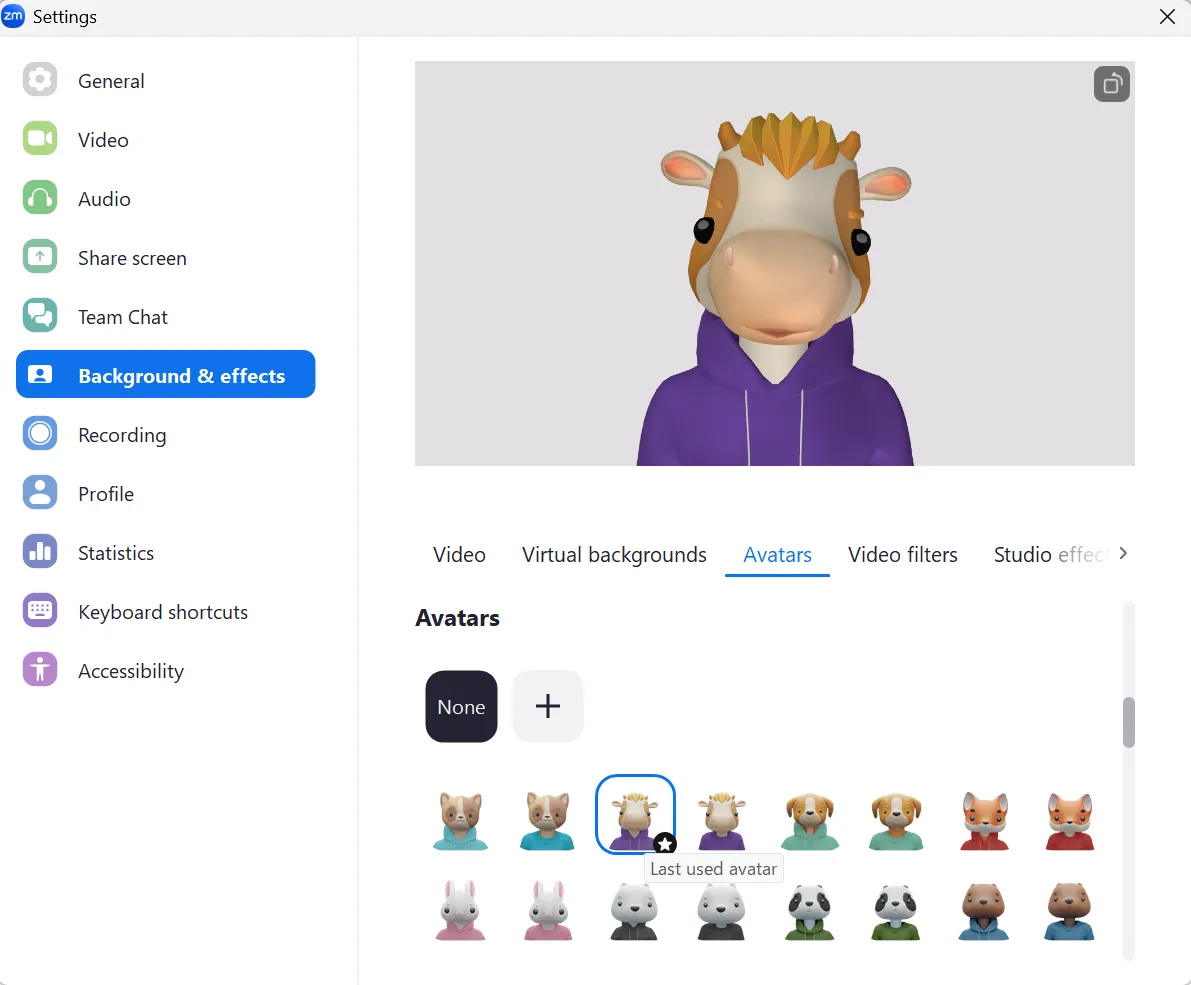 3. Select the avatar of your choice. (When an avatar is set, the camera background will disappear, and only the avatar will be displayed. If a virtual background has been set, the image will be displayed behind the avatar.)