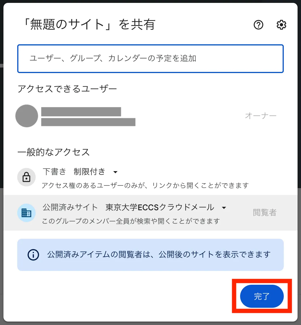 • 「東京大学ECCSクラウドメール」を選択した場合,ECCSクラウドメールのユーザーだけが閲覧できるようになります.大学構成員に公開範囲を限定したいときは,「東京大学ECCSクラウドメール」を選択してください.