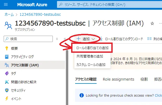 3. メイン画面上部に表示された選択肢から+追加をクリックし,ロールの割り当ての追加を選択して下さい.