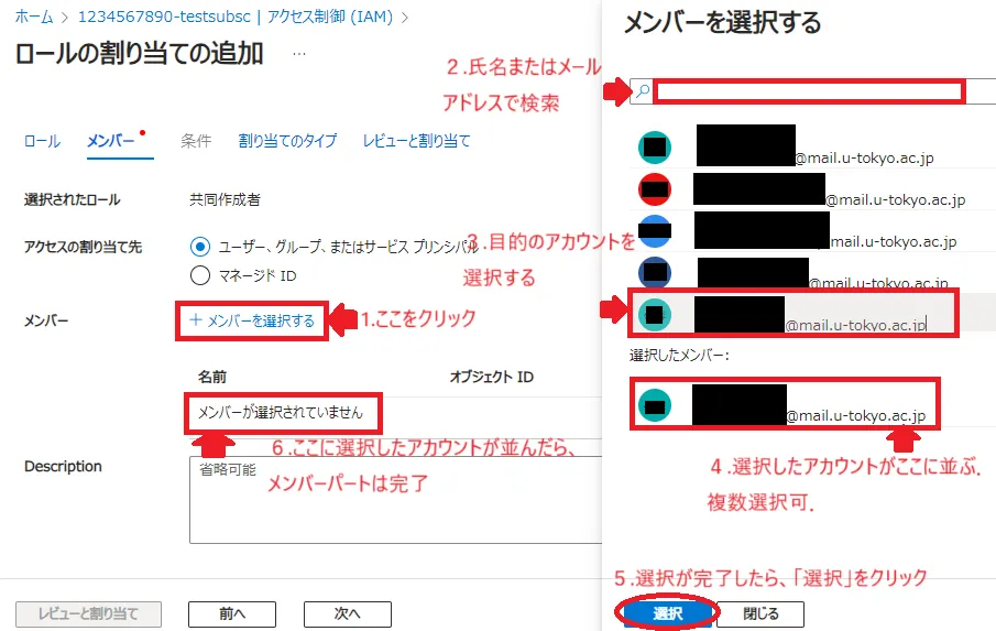 • メンバー:(下図参照)+メンバーを選択するをクリックしてください,右側に権限を付与したいアカウントの検索・選択画面が現れるので,条件を絞って検索し権限を付与したいアカウントを見つけ出して選択してください.最後に選択画面下にある選択をクリックすると左のメイン画面に選択したメンバーが表示されます.