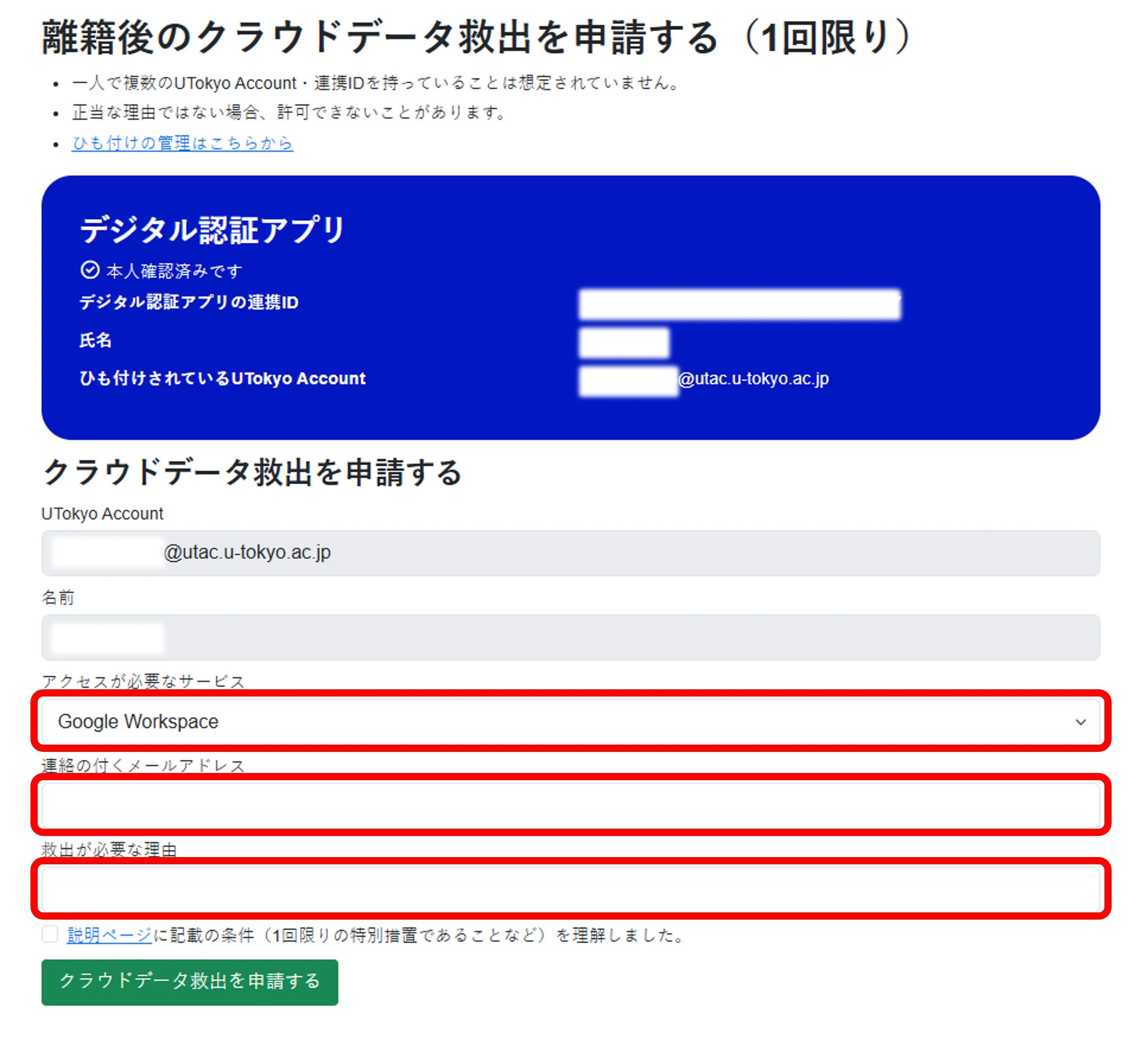 クラウドデータ救出を希望する方は「UTokyo Account本人確認サービス」を通じて申請してください. UTokyo Account本人確認サービスを利用できない場合は,「UTokyo Account本人確認サービスを利用できない際の対応」をご覧ください.
